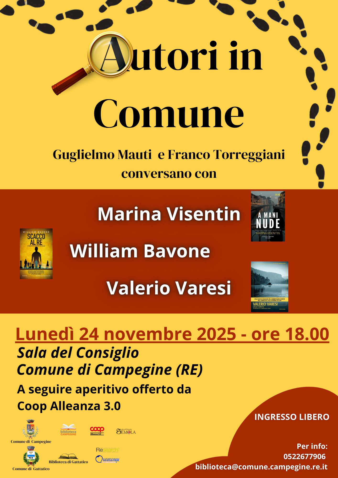 Lunedì 24 Novembre 2025, ore 18, in Municipio si terrà l'incontro "Autori in Comune": Guglielmo Mauti e Franco Torreggiani conversano con Marina Visentin, William Bavone e Valerio Varesi.